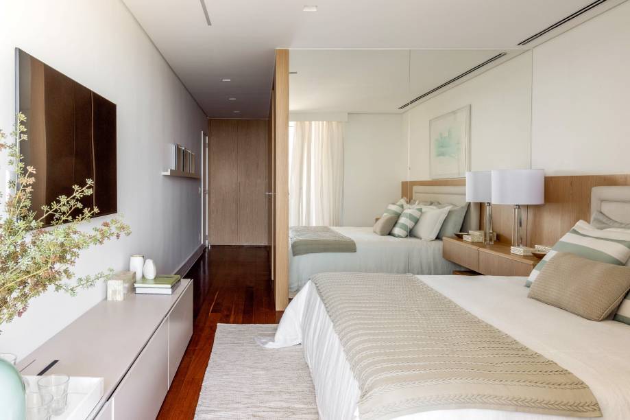 No quesito “paleta de cores, materiais e acabamentos”, foi adotada uma base neutra em todo o apartamento, exceto no hall de entrada, que foi pintado de verde azulado (cor Volta ao Mundo, da Suvinil), inclusive o teto e a porta “mimetizada”, criando, assim, um efeito de “caixa”. Na decoração, no geral, as cores são variações do próprio verde e aparecem pontualmente em acessórios, adornos, quadros e estofamentos para não pesar visualmente nem cansar com o tempo. Já na varanda, predominam tons de cinza, bege e verde.