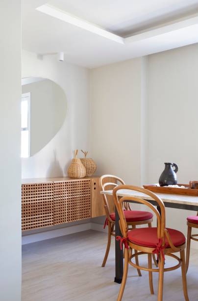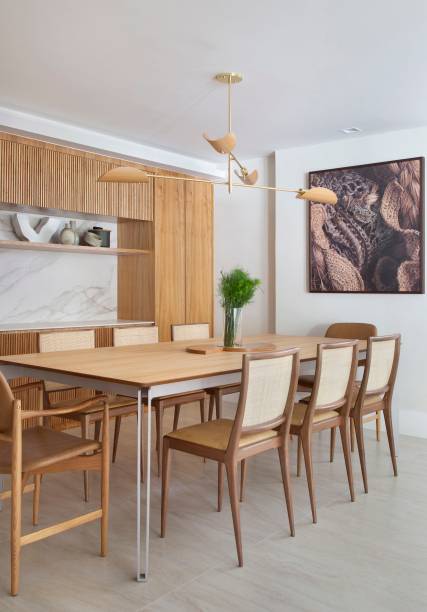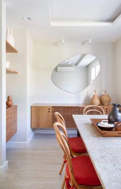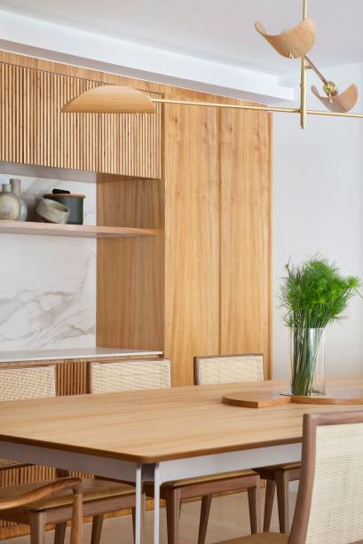 Na parede ao fundo da sala de jantar, a designer investiu em armários de madeira que formam um grande painel (ora lisa, ora ripada), com um grande nicho central revestido de pedra natural ao fundo e quartzo na bancada, fazendo o ambiente parecer mais profundo e imponente, sem abrir mão dos espaços de armazenamento.