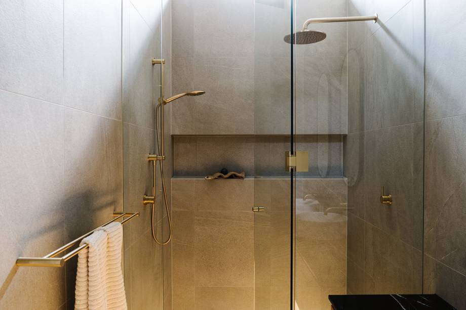 “Queríamos usar uma estética de madeira texturizada consistente e optamos por integrar a marcenaria folheada Blackbutt para combinar com a cama master sob medida que eles amavam. As luminárias tinham acabamento em latão ou preto que combinava com os detalhes nas portas de aço e na iluminação, ajudando a manter uma paleta consistente”, dizem os arquitetos.