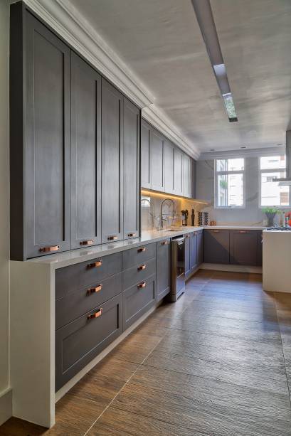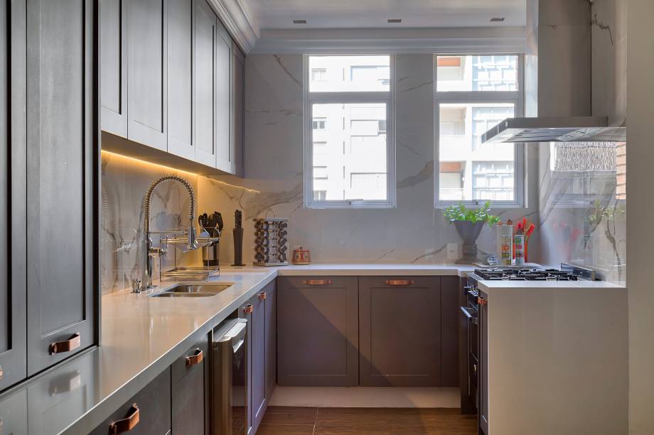 Os revestimentos também reforçam o aspecto clássico do apartamento. O mármore nos banheiros cobre parte das paredes e nichos, e dá sustentação para a banheira. Na cozinha, a pedra também aparece nas paredes, enquanto o porcelanato imita madeira e faz dupla com os armários de estética vintage para criar a atmosfera de sofisticação.