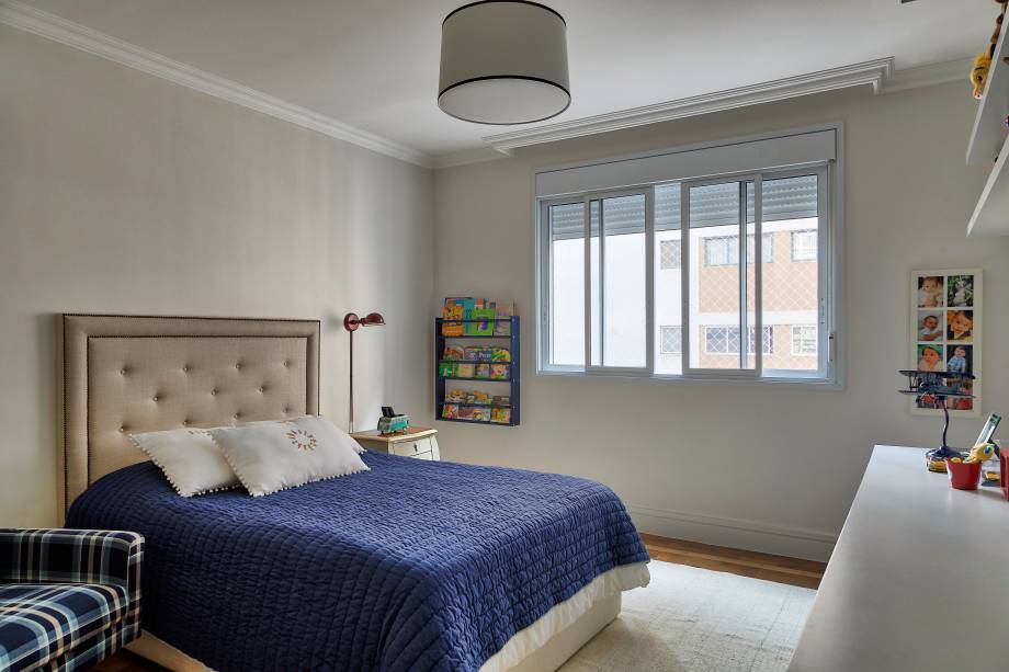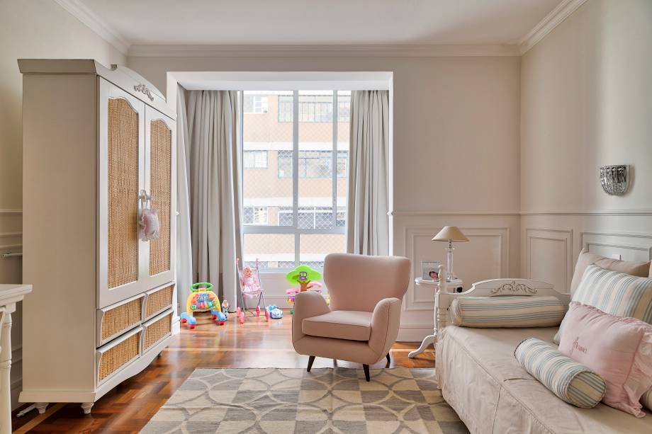 O estilo clássico aparece de novo nos quartos que receberam boiseries – uma espécie de moldura para paredes, muito comum na França do século XVIII – e cabeceiras amplas de capitonê.