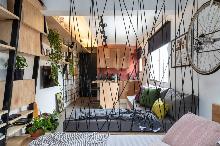 O apartamento de 24 m² teve a estrutura alterada para integrar os ambientes, para aumentar o espaço e a iluminação