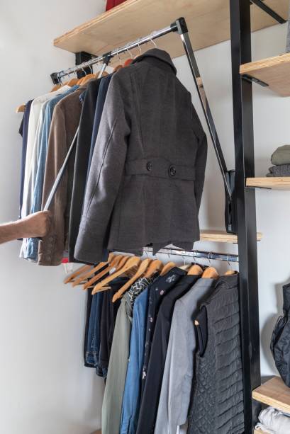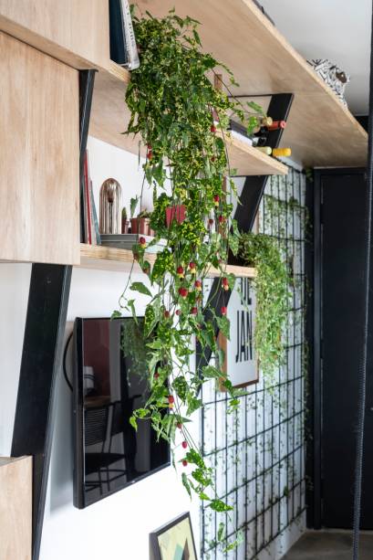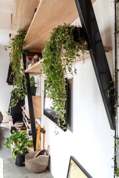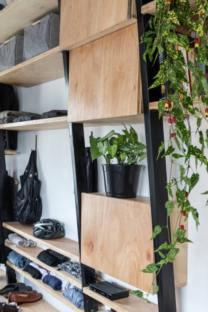Com a integração dos ambientes, outro ponto difícil de resolver foi o armário do dormitório. Surgiu então a ideia de fazer uma estante closet inclinada que percorre quase toda a extensão do apartamento. Este elemento, em compensado aparente e estrutura metálica com pintura eletrostática, sem dúvida, é o maior destaque do projeto.