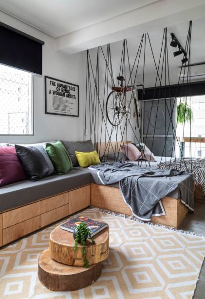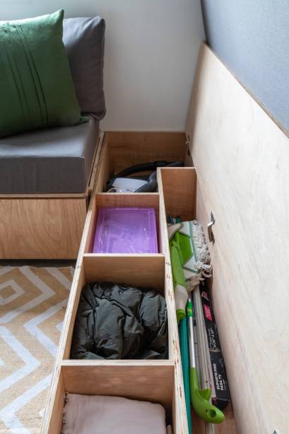 O sofá, desenhado pelo escritório, feito sob medida, desempenha várias funções. Do lado da cama, tem gavetas. Já do lado da sala, foi reservado um espaço para escada, aspirador, rodo e vassouras.