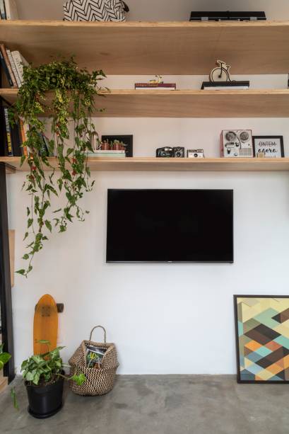 Na parte do dormitório, é utilizada como guarda-roupa e caixas ajudam na organização. A sala conta com poucos elementos mais decorativos e também foram usadas caixas para ajudar na organização.