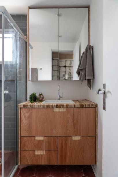 No banheiro o mesmo revestimento da cozinha foi instalado, com paginação diferente. Os azulejos usados foram o metro gray, enquanto a marcenaria do banheiro é toda em compensado naval e a bancada do lavatório em Teca natural. O piso do restante da casa é todo em cimento queimado feito em obra e depois impermeabilizado. E sem rodapé!