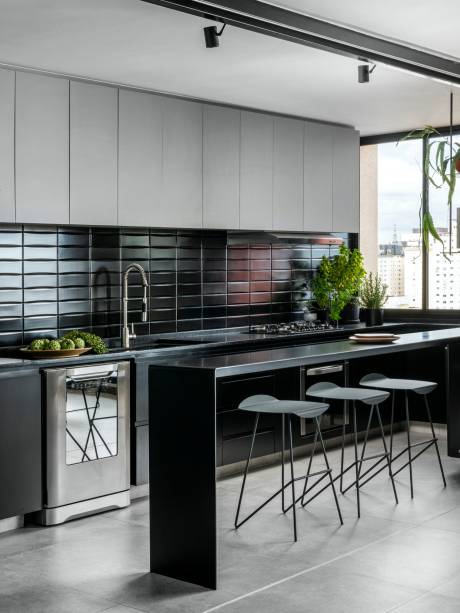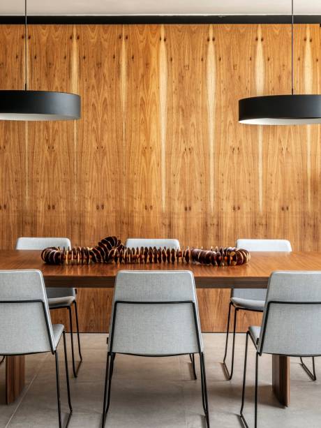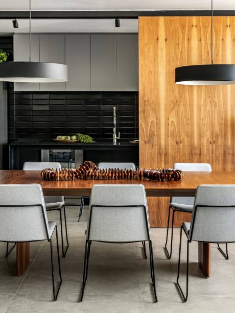 Elegante e com ares minimalistas, a decoração conta com peças de desenho simples e precisos, caso do balcão esbelto que separa a cozinha do living quando o painel de freijó está aberto. Essa madeira, aliás, é um dos elementos que podem ser vistos em vários momentos. Além de ter sido usado na porta de correr, que torna os ambientes mais versáteis, o freijó dá forma ao rack e à mesa de jantar. A madeira se contrapõe ao cinza escuro do piso e dos armários da cozinha.