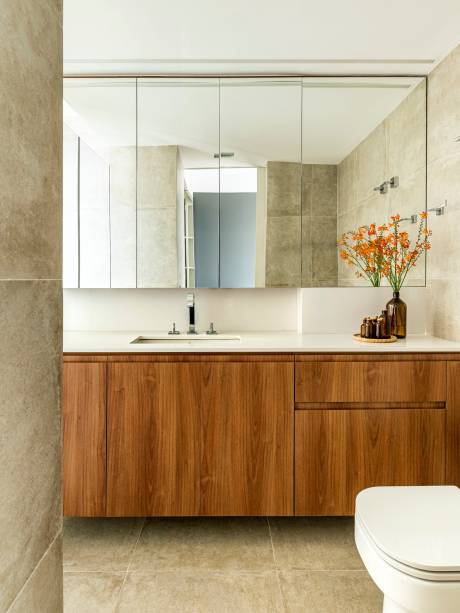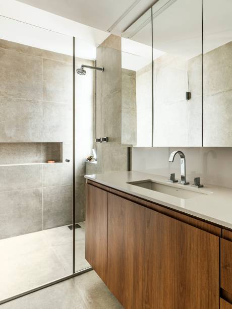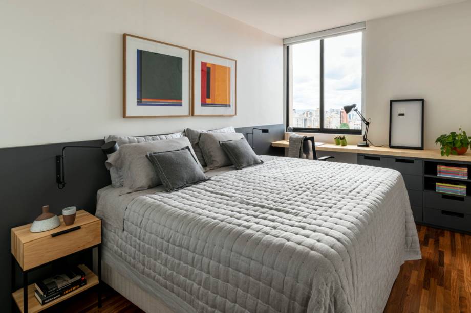 O quarto e os banheiros seguem o mesmo estilo de decoração do restante do apartamento, com cores neutras e design de linhas sóbrias e elegantes. A cabeceira cinza com luminárias embutidas dá o tom contemporâneo e urbano à suíte, que conta, ainda, com um closet escondido atrás do espelho.