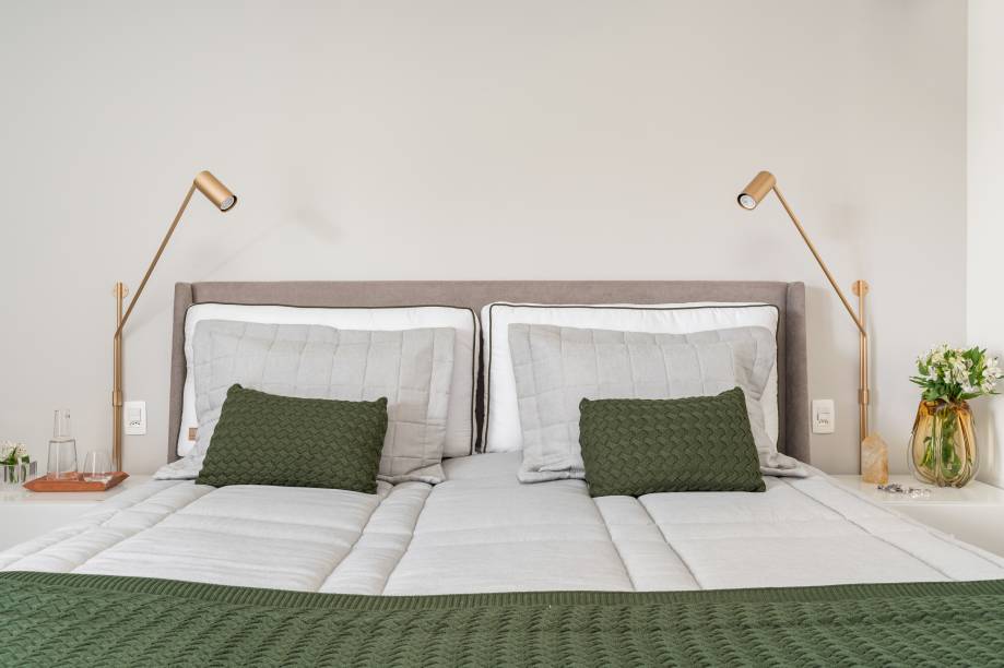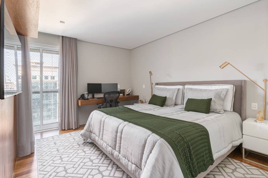 No quarto do casal foram mantidos os elementos principais, como o painel e a escrivaninha, mas foi feito um retrofit, com a inclusão de uma cabeceira estofada, mesinhas de cabeceira nos dois lados da cama com iluminação, para os momentos de leitura, além de uma produção em decoração e enxoval.