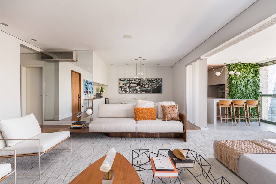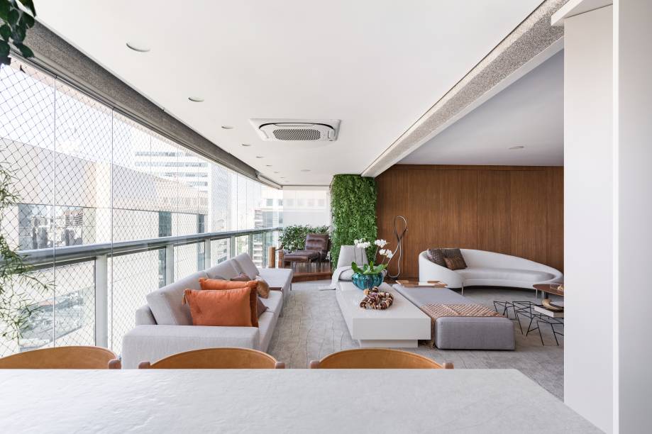 O apartamento era dividido em sala de estar, sala de TV e jantar, que foram totalmente integrados à varanda com a retirada da esquadrilha, tornando a área social em uma sala de recepção ampla, sofisticada e moderna.