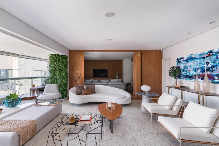 Apenas a porta da entrada e o painel que separa o living da sala de TV foram mantidos, ambos em lâmina natural de madeira. O painel ainda permite a separação dos ambientes quando necessário.