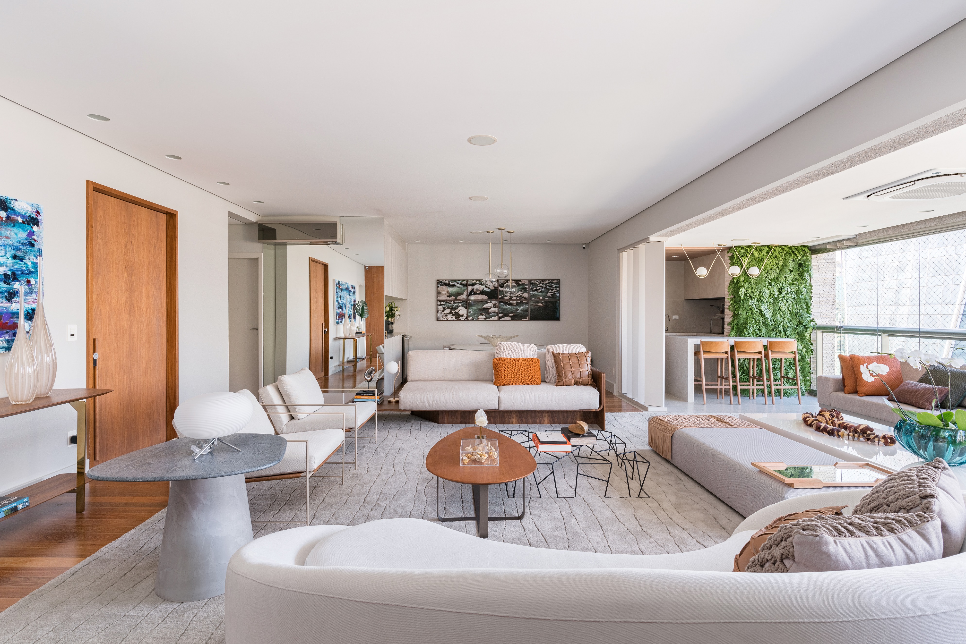 Os destaques do projeto estão no quadro da artista Gigi Monteiro, que fica no hall de entrada. Além disso, chamam atenção as paredes verdes das duas extremidades da varanda, o tapete comprido que conecta toda a extensão do living e as poltronas da entrada, que possuem belíssimos detalhes em seus encostos, proporcionando uma estética visual que recepciona ao abrir a porta.