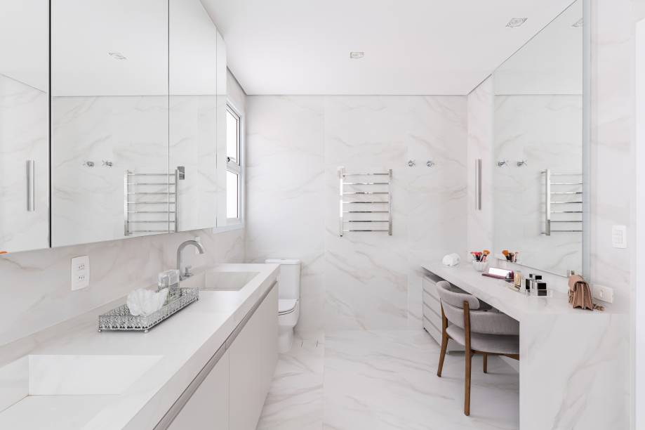 O banheiro ganhou reforma completa. O revestimento foi todo trocado, por porcelanato em tom claro. O piso, mesa e bancada de make com iluminação receberam o mesmo revestimento para dar um aspecto de continuidade. Uma banheira de imersão também foi colocada a pedido da moradora por ser algo que ela queria muito e por deixar o espaço mais sofisticado.