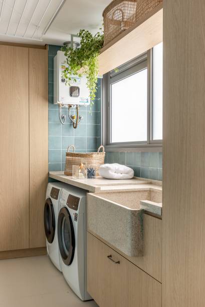 Com revestimento colorido e móveis em um tom mais claro de madeira, a lavanderia ganhou ares de área social.
