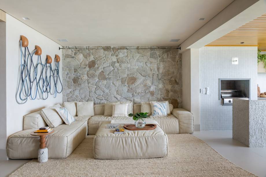 Conectada a ela está o living — que, por sua vez, se liga à varanda e ao ambiente externo. Ali, a opção foi explorar diferentes tons de bege e usar, na parede, a pedra natural para dar um toque mais rústico e aproximar a estética interna e externa.