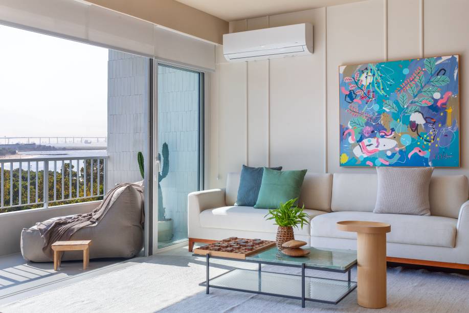 Na decoração – que segue o estilo contemporâneo, com elementos naturais, linhas simples e texturas que evocam a sensação de aconchego -, com exceção da escultura linear composta de peças cerâmicas interligadas (da artista chilena Mariana Canepa) na parede da sala de tv (acima do buffet), todos os itens são novos. Entre as peças de design assinado, na área social, vale destacar a mesa de jantar Tora (criação da Plataforma 4 para a Lider Interiores), a premiada mesa de centro Fachadas (do Studio Lucas Caramés) e a poltrona Sato, com estofamento em tecido azul (do designer Ronald Sasson). Entre as obras de arte, na sala de estar rouba a cena o quadro azul com toques de rosa e amarelo, acima do sofá, encomendado pelos clientes ao artista Bruno Lyra no final da obra.