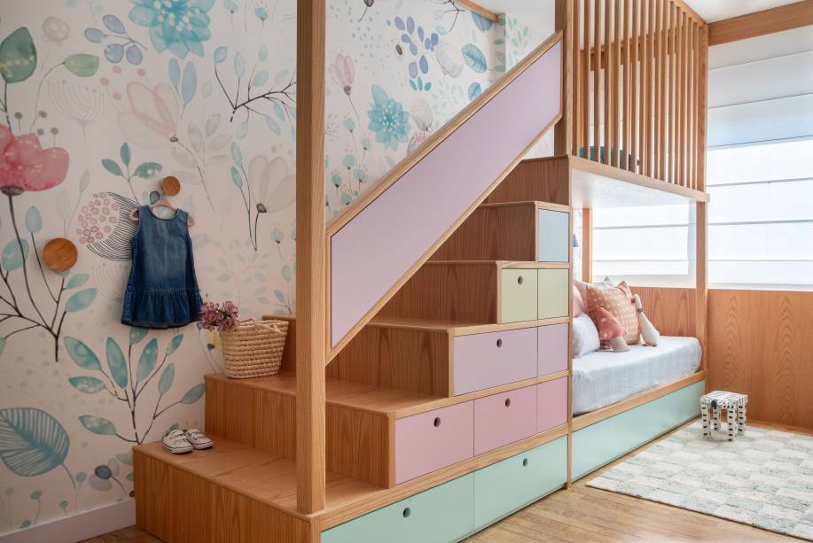 Já no dormitório da filha, a cereja do bolo é, sem dúvidas, a marcenaria multifuncional desenhada pela arquiteta, composta de cama, mezanino, bicama, gavetas e gavetões ao longo da escada – que repetem os tons do papel de parede – e o enxoval da Nara Maitre, que mescla diferentes texturas e estampas, em especial xadrez e floral.