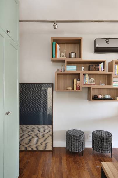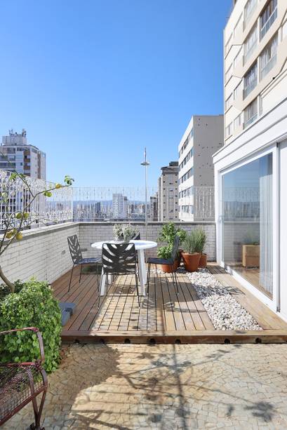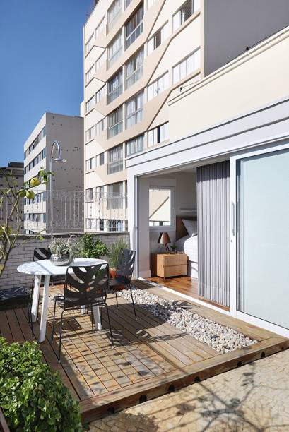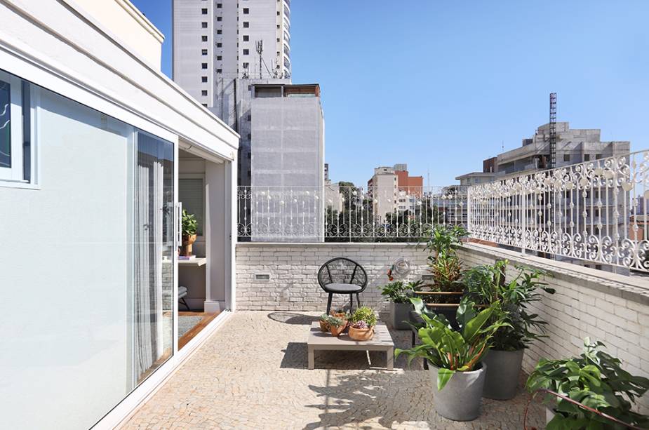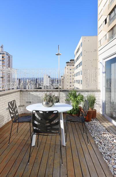 Antes, o local continha dois quartos, sala, cozinha e banheiro. Após as modificações, ele tem um único quarto suíte, cozinha aberta e mais um banheiro social. O terraço ficou um pouco menor, mas bem aproveitado. Ao avançar com a porta, a atual proposta arquitetônica trouxe conforto aos ambientes (sala e quarto) e ainda sobrou espaço no terraço.