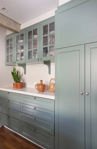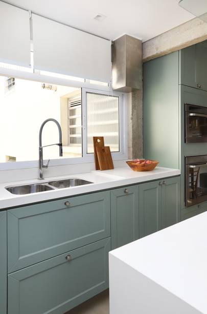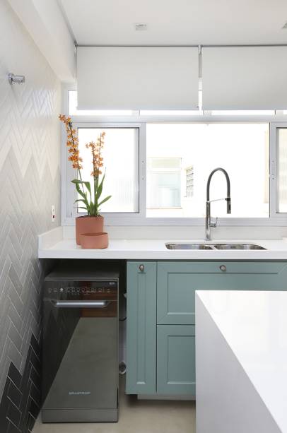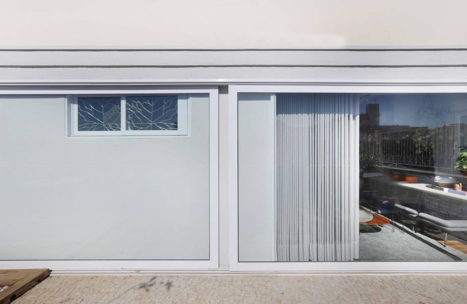 Devido à ampliação da área interna em direção às laterais do terraço, os escritório criou, no canto da sala, uma janela extra que dá abertura para luz natural entrar. Outra grande mudança foi na cozinha. A geladeira foi deslocada para deixar mais espaço de circulação.