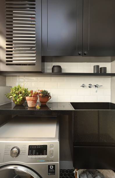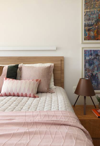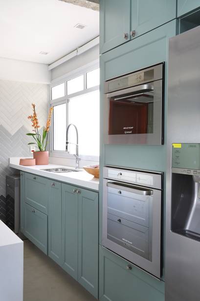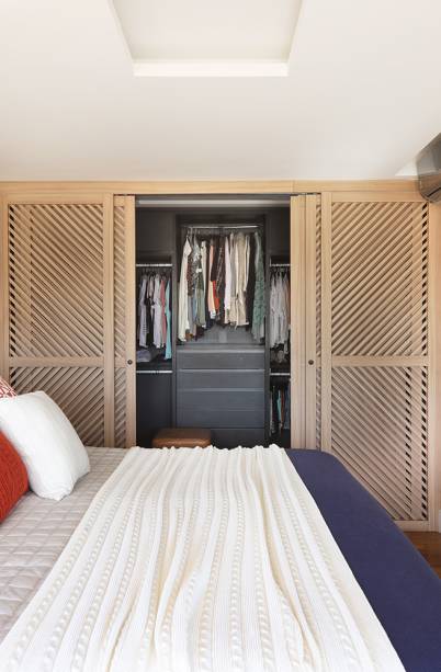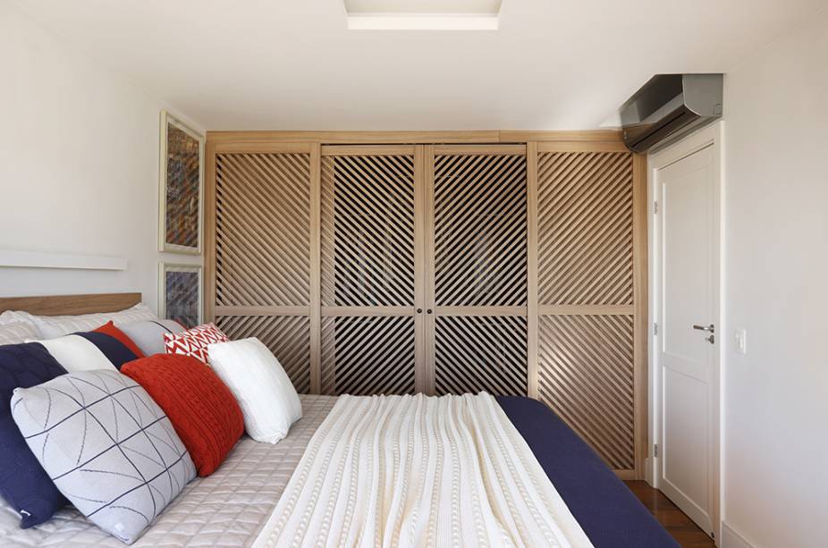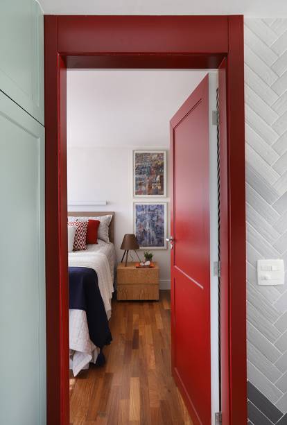 Para a decoração, a opção foi contrapor alguns estilos, por exemplo os armários mais clássicos junto de propostas mais modernas. Peças de madeira compõem a base neutra as quais destacam as partes coloridas. No quarto, a clássica cartela de azul, vermelho e branco predominam, mas são exploradas de forma atual.