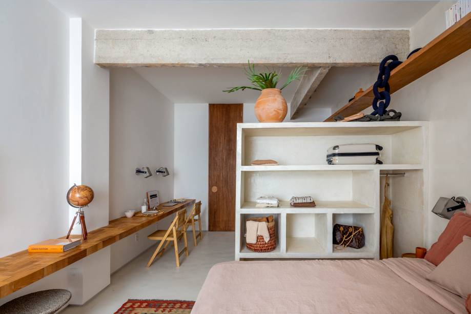 “Como havia uma limitação orçamentária, economizamos ao máximo na marcenaria e apostamos em estruturas de concreto branco, amplas e abertas, para criar espaços de armazenamento que podem, inclusive, ser fechados posteriormente”, explica Pedro.