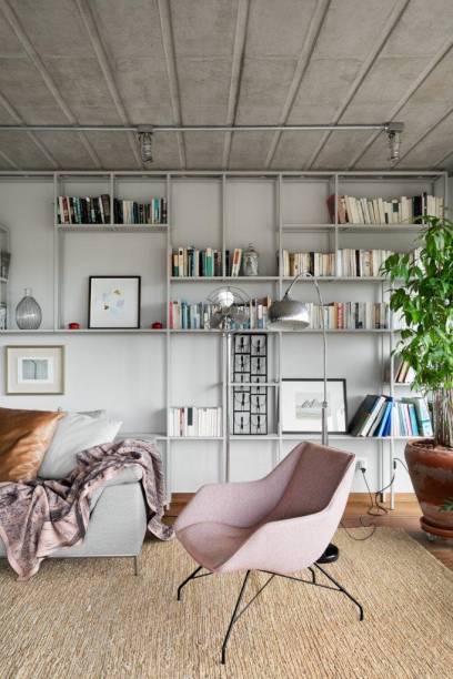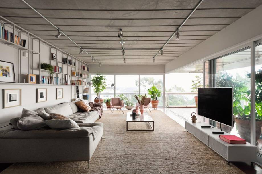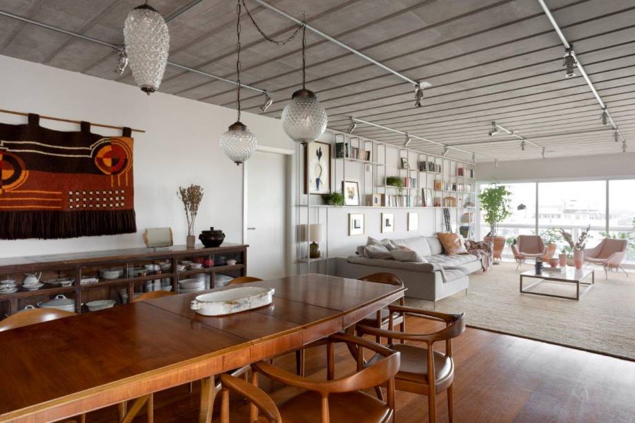 O forro do imóvel foi retirado e a laje existente, que era muito bonita, completamente revitalizada. Também foi desenvolvido um novo projeto de iluminação na área social. E apenas o piso em madeira foi mantido.