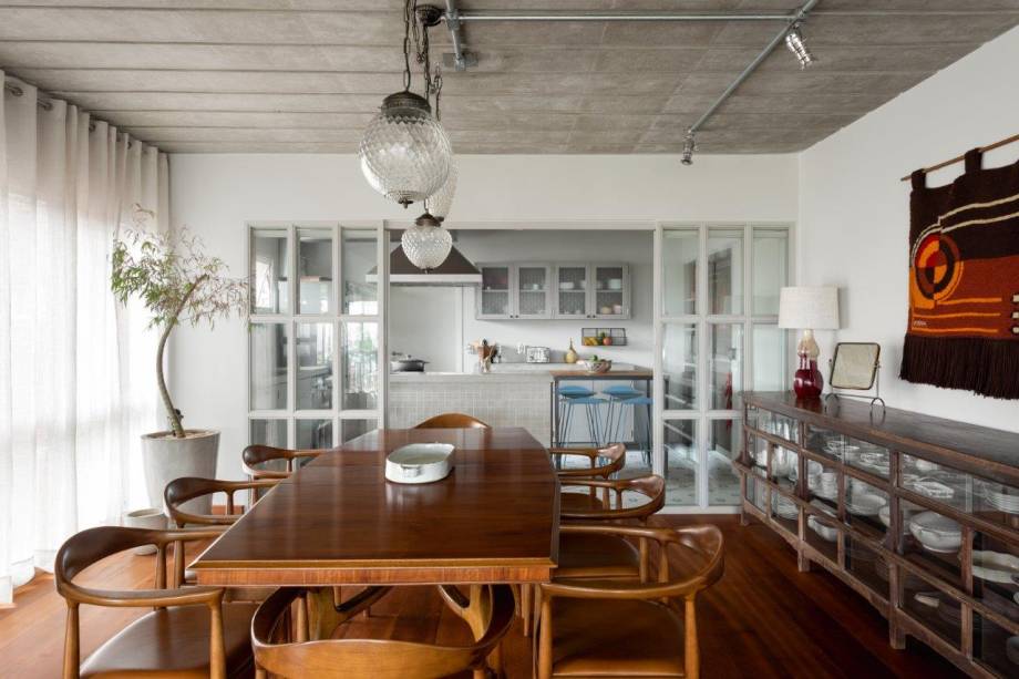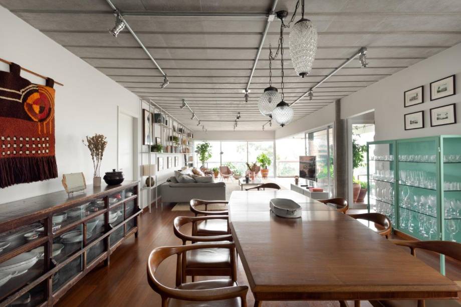 A reforma, assinada pelo Memola Estudio e por Vitor Penha, integrou a área social e apostou em peças de mobiliário garimpadas