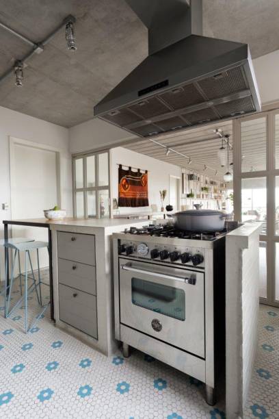 A bancada rústica, em concreto feito in loco, proporcionou o contraponto perfeito. Sua parte frontal recebeu ladrilho hidráulico em tom neutro, assim como a marcenaria, em cinza claro, para que todas as cores ficassem harmônicas e o piso recebesse a importância que merece.
