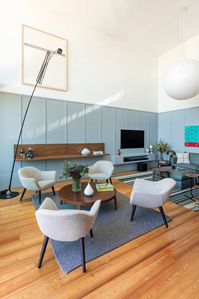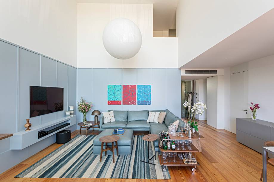 Para chegar nesse resultado, a arquiteta usou como ponto de partida o sofá: feito de couro, num tom azul acinzentado, o móvel determinou a paleta de cores da área social do imóvel, que tinha uma configuração complicada por ter um mezanino – onde estão os quartos – e um pé-direito muito alto na sala de estar.