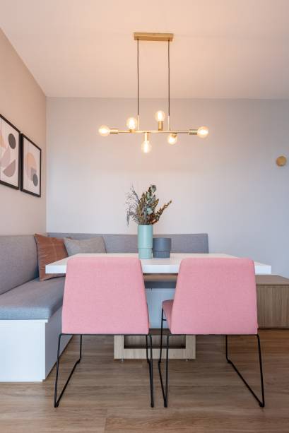 A sala de jantar apresenta um canto alemão para maximizar o espaço e servir como uma sapateira. Esse cantinho se tornou um local funcional para sentar, tirar os sapatos e guardá-los.