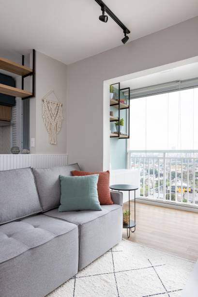A varanda, embora compacta, foi projetada com espaço de armazenamento adicional, incluindo um pequeno banco com gavetas e um aparador com portas. Uma estrutura de serralheria permite o cultivo de plantas, mantendo o espaço aberto para futuras adições, como uma poltrona.