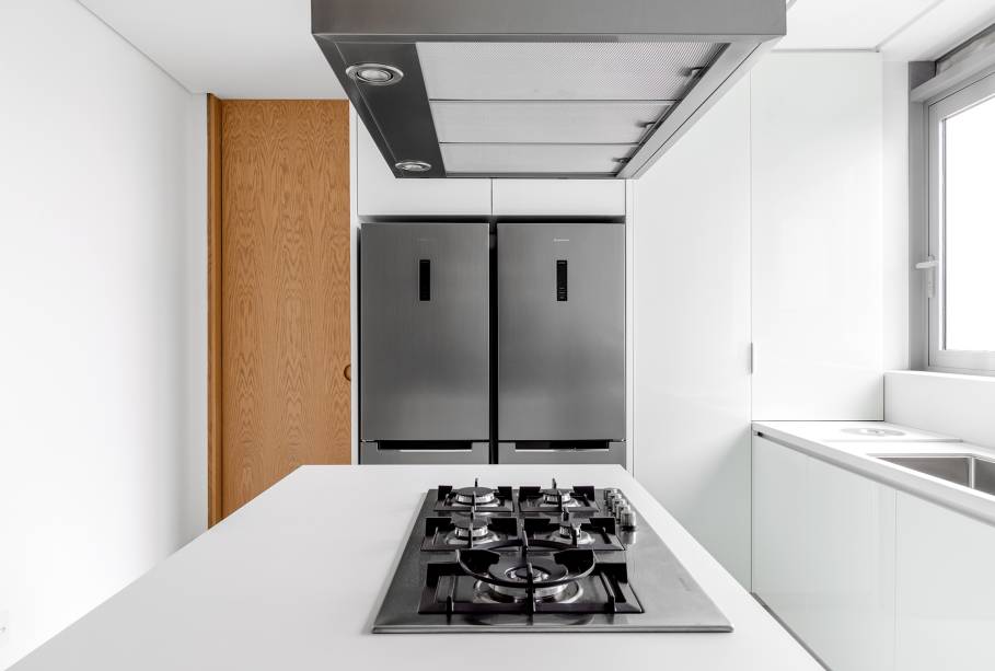 A cozinha branca, por sua vez, possui portas confeccionadas em vidro italiano da Cinex, e, para contrastar com o exterior claro, o interior dos armários recebeu um acabamento grafite escuro, conferindo um toque de exclusividade.