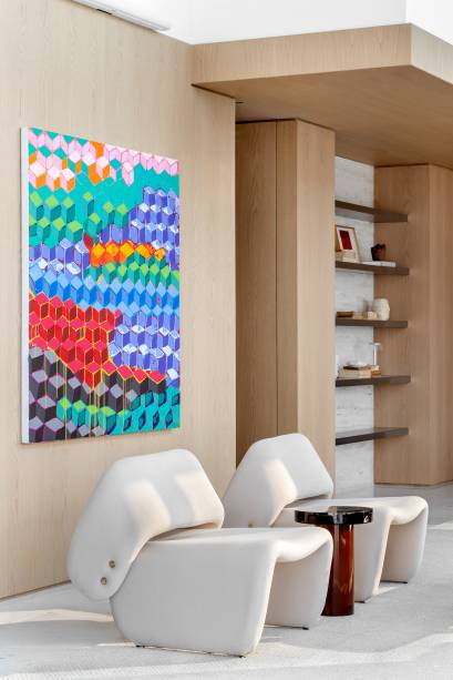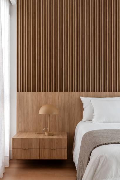 Sistema de caixas embutidas em painel de madeira é destaque neste apê