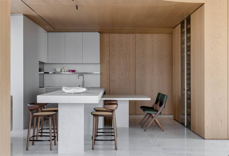 Na entrada, um novo layout promove a interação entre diferentes espaços, integrando cozinha, área para receber convidados e um espaço para degustação de vinhos em um ambiente amplo.