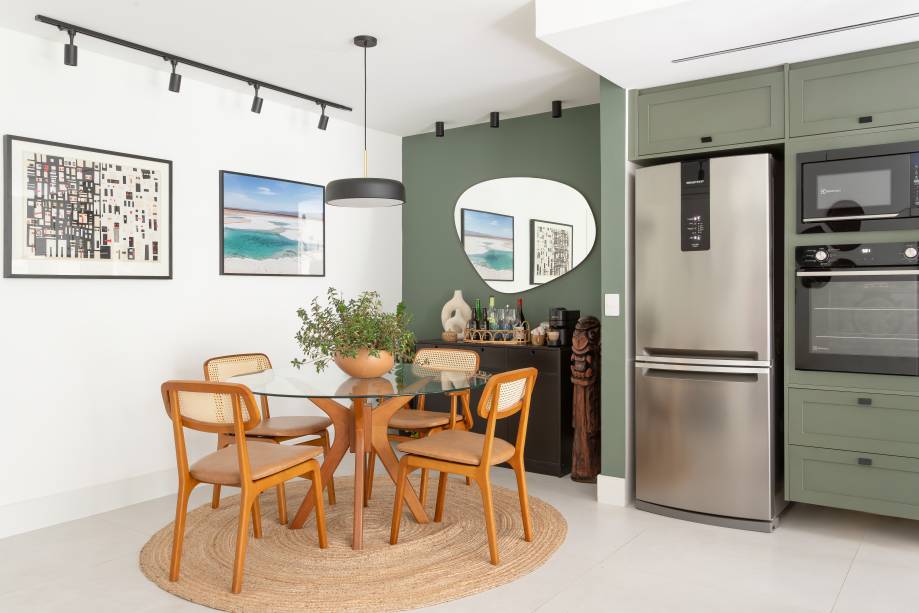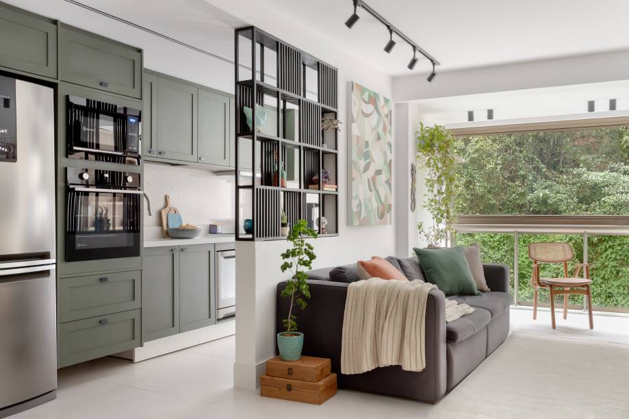 Um painel vazado de serralheria conecta visualmente os cômodos e ainda cumpre função decorativa. A cozinha ganhou um tom de verde que se estende até a sala de jantar, trazendo frescor e unidade. Já a sala de TV ficou mais aconchegante com armários em um tom “solar” e móveis que misturam o moderno com o artesanal.