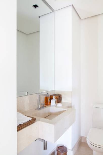 As cores neutras dos acabamentos compõem com as cores pontuais nas peças do mobiliário, como tapetes e almofadas e nas peças expostas, tais como livros, vasos e recordações de viagens, permitindo que as lembranças da família façam parte da decoração, assim como a coleção de quadros e aquarelas da moradora, quem além de psicóloga é pintora e pianista.