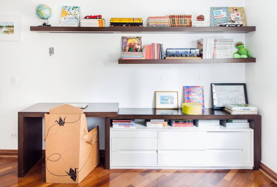 Toda a marcenaria foi desenhada especialmente para o apartamento, tais como mesa de jantar, aparador, painéis, estantes das salas e dos dormitórios. Veja mais fotos na galeria abaixo!