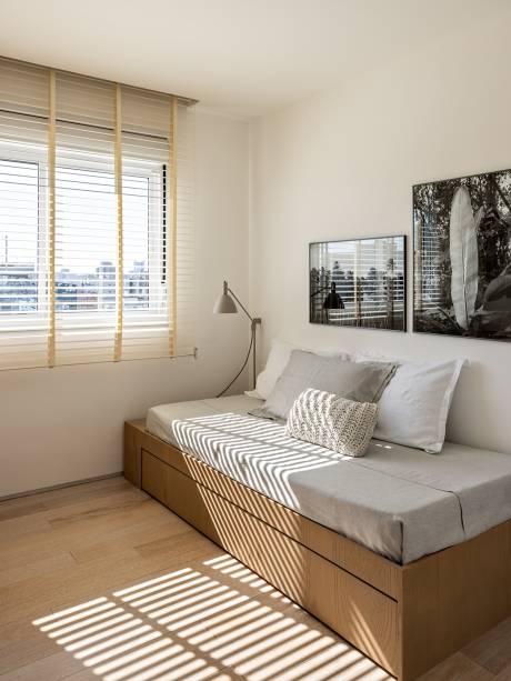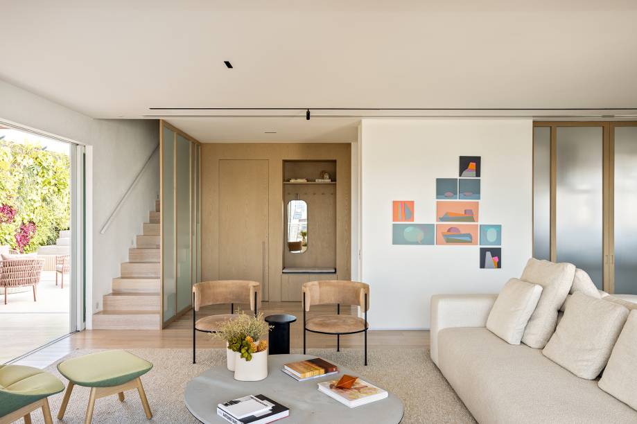 Para atender essas expectativas foram criadas superfícies translúcidas e ritmadas de madeira e vidro, aliadas a planos de paredes brancas, sem perder o aconchego e personalidade. Como o imóvel era escuro, com revestimentos pesados, e sua disposição não valorizava a vista, a principal alteração do pavimento térreo foi a reconfiguração da escada e da entrada social – com a inversão do layout, ali agora há uma chapelaria e o lavabo.