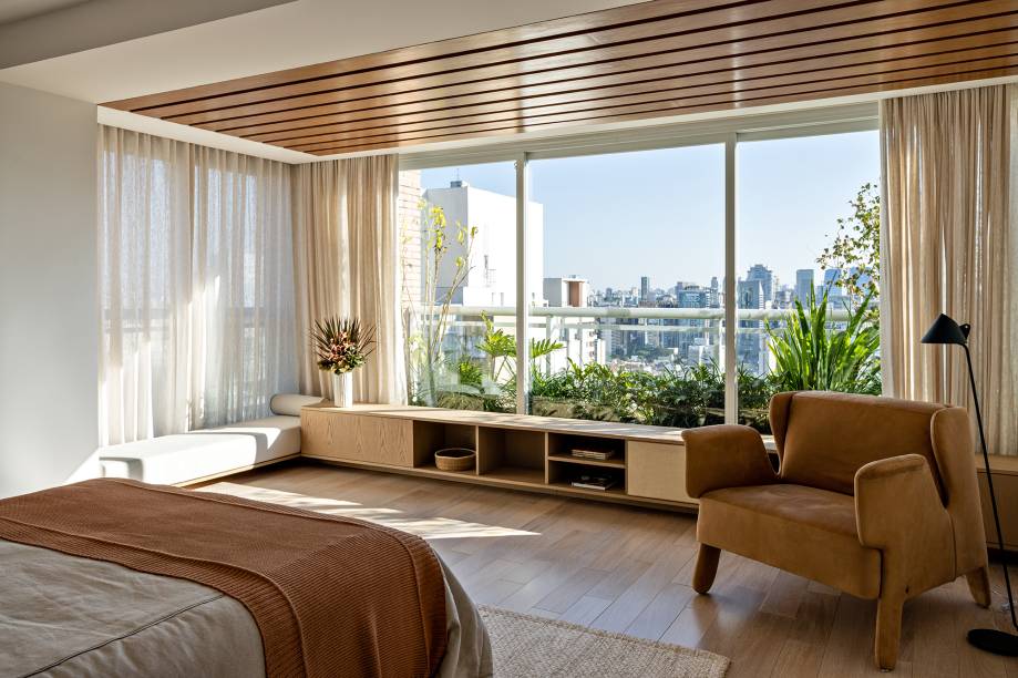 No pavimento superior, a integração da varanda possibilitou a ampliação do closet, suítes e escritório e permitiu a criação de uma jardineira e a valorização da vista privilegiada.