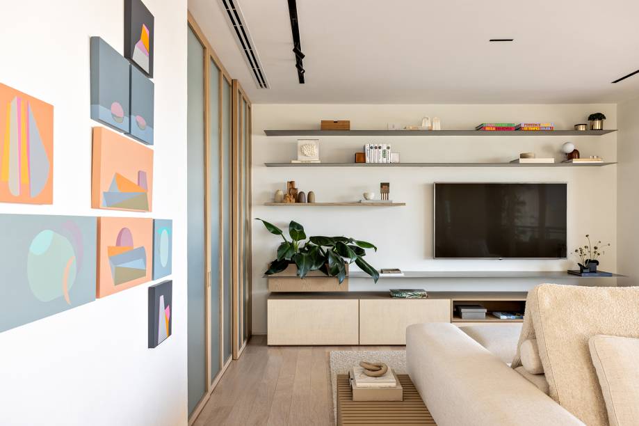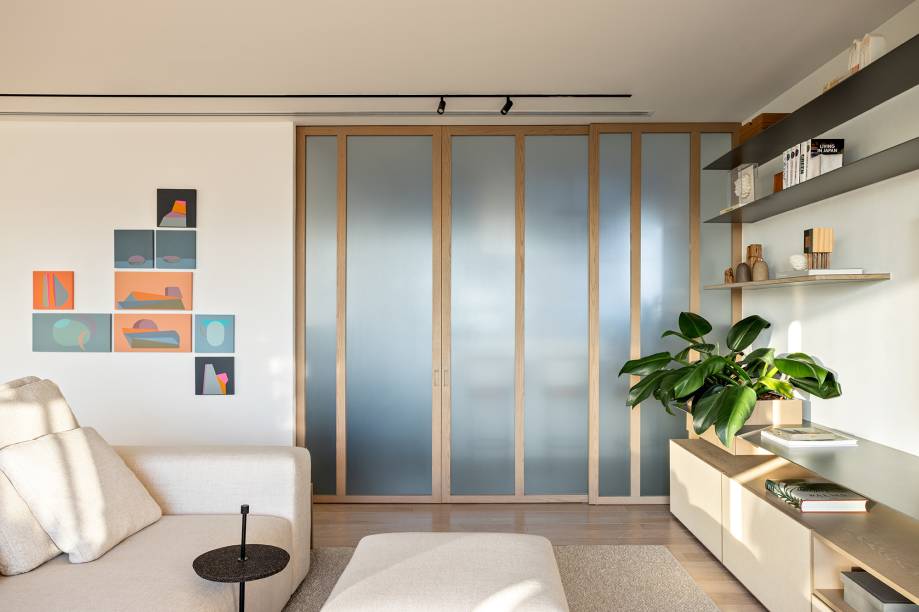 Superfícies de madeira e vidro e paredes brancas marcam apê de 350 m²
