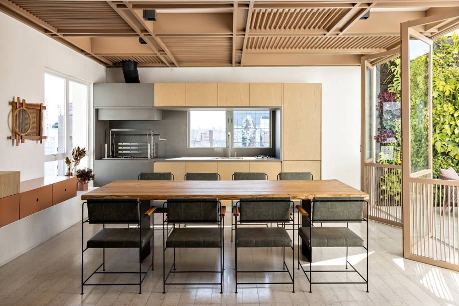 Na cozinha, a escolha do ladrilho verde para o revestimento do piso em da meia parede dialoga com a marcenaria de laca de tom semelhante. “Já nos mobiliários, brincamos com contrastes entre diferentes texturas e cores, que aparecem pontualmente no sofá Benjamin, do De Carvalho e na poltrona Uchiwa da HAY”, finalizam as arquitetas.