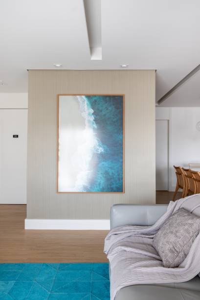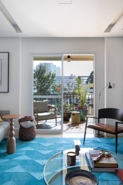 Tapete geométrico azul é ponto de destaque na sala deste apartamento