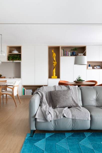 A escolha de um tapete geométrico azul vibrante confere vivacidade ao ambiente, contrastando harmoniosamente com a paleta neutra predominante. Estantes planejadas com nichos personalizados garantem organização e permitem a exposição de livros e outros objetos decorativos, tornando o espaço mais personalizado e acolhedor.