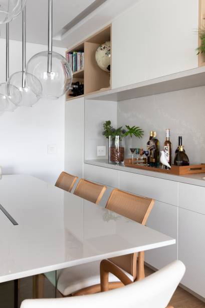 A parede de armário desenhada pelo escritório Rawi Arquitetura + Design serve de buffet, onde guardam tudo necessário para um bom evento de jantar. No centro da parede, Raphael Wittmann acomodou um bar com as bebidas favoritas.