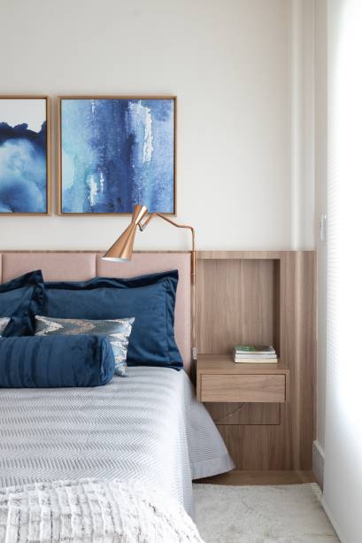 No primeiro dormitório, o painel de madeira junto com a cabeceira estofada abraça os moradores para boas noites de sono. Os quadros acima da cama produzem pontos de cor, assim como nos outros ambientes do lar, e a escolha do azul com bege cria um contraste primoroso.