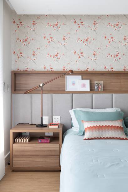 No segundo dormitório, o papel de parede floral em tons suaves traz um toque romântico e delicado ao espaço, complementada com a funcionalidade da combinação de um painel ripado de madeira com uma cabeceira estofada em tecido cinza claro, que traz textura e conforto ao ambiente.