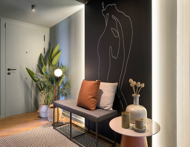 A marcenaria preta da TV abriga objetos em nichos iluminados. No painel está camuflada a porta de acesso à área íntima.