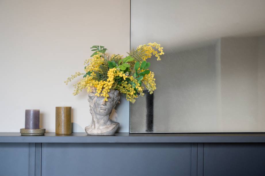 O grande destaque é área externa de 77 m² que funciona como um solário: banco, mesa e muitas plantas criam um verdadeiro living nas alturas. Um banco personalizado se destaca em uma das laterais para gerar uma ampla área de jantar.