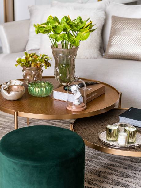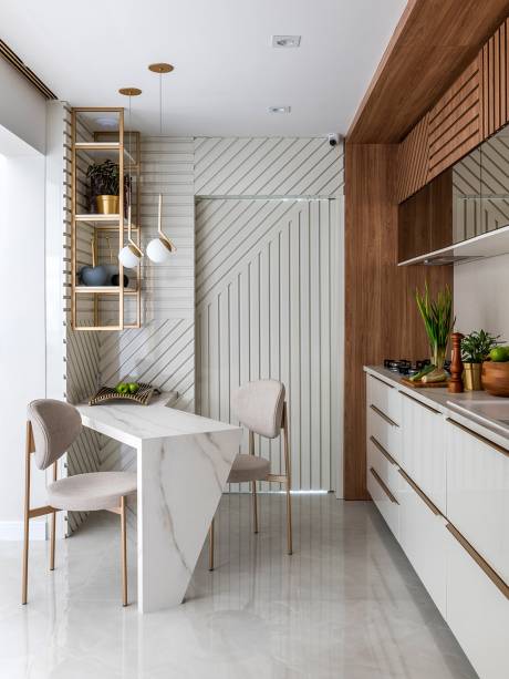 No décor, foi utilizada uma paleta de tons claros e neutros com alguns detalhes no amadeirado e dourado, que se sobressaem no ambiente principal.