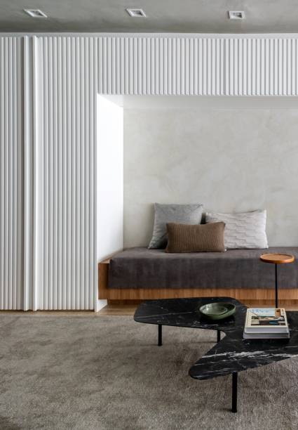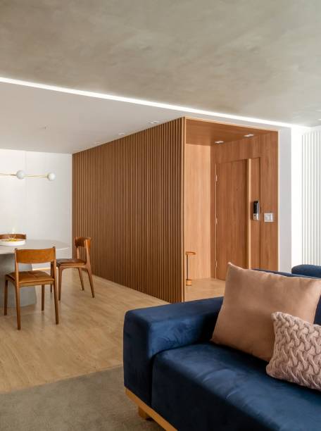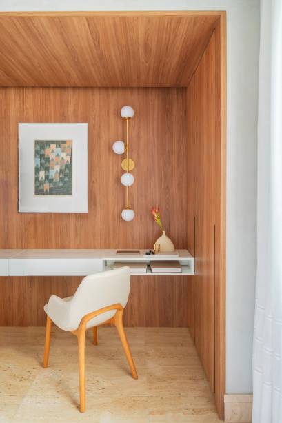 No décor, os arquitetos destacam o corredor de acesso com paredes e teto revestidos em madeira para trazer aconchego, a bancada fixada na parede que também funciona como penteadeira e os tons neutros do décor que transmitem calma e tranquilidade. Todos os tapetes do apartamento são da Hathi.